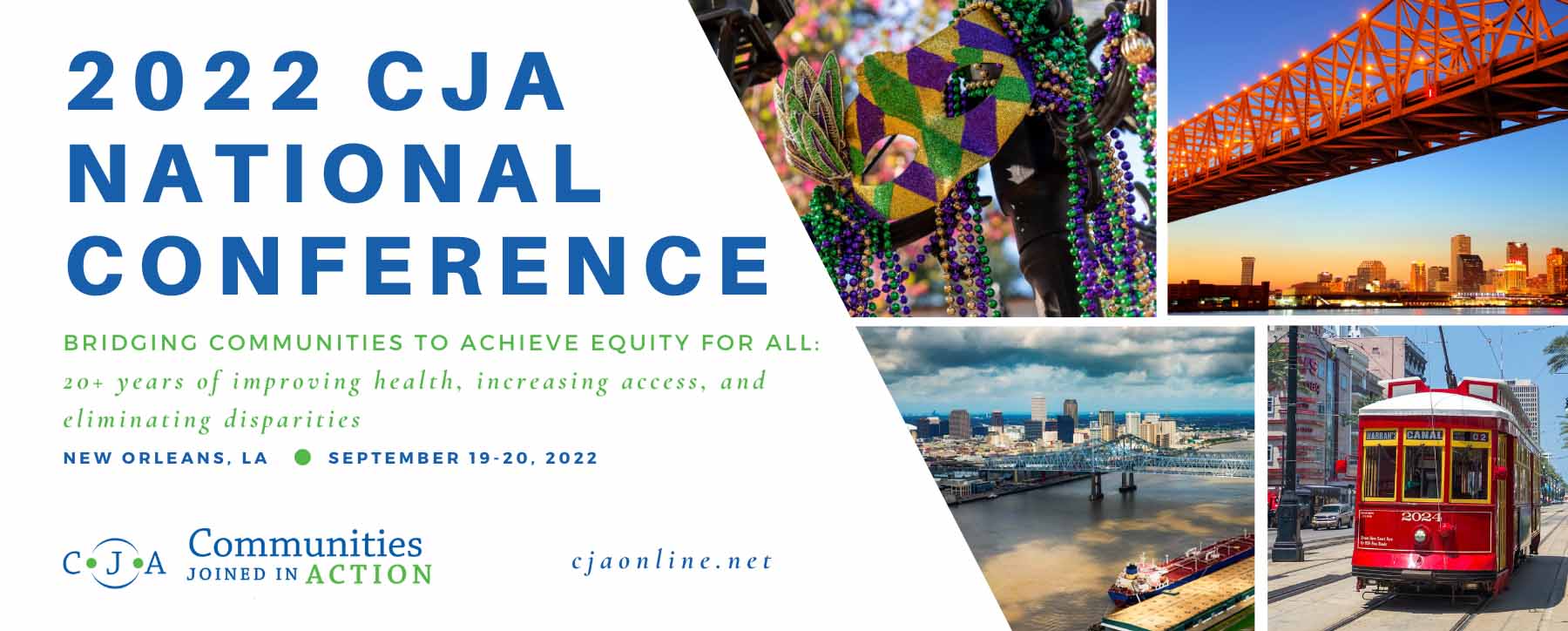 Communities Joined in Action (CJA) reconvened for the 2022 CJA National Conference after a two-year hiatus due to the COVID-19 pandemic. With a theme of “Bridging Communities to Achieve Equity for All,” CJA brought together health champions from across the country to New Orleans, LA, September 19-20, 2022. The mission of CJA is to connect and equip communities with tools to improve health equity and well-being. CJA is a national membership organization committed to improving health and eliminating disparities.
